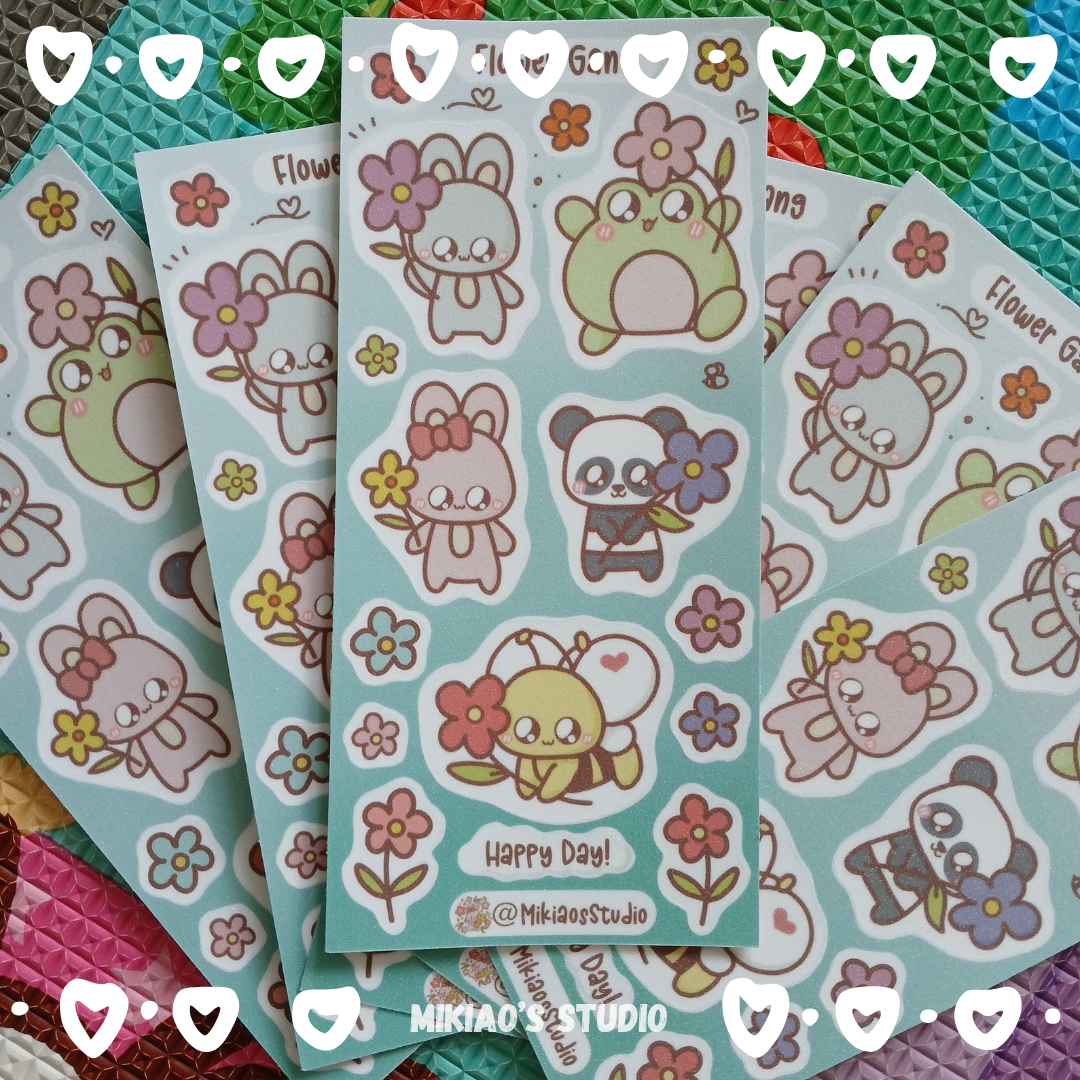 Our characters love flowers! See them carry a flower in their hands in this sticker sheet! May you have a happy day every day!